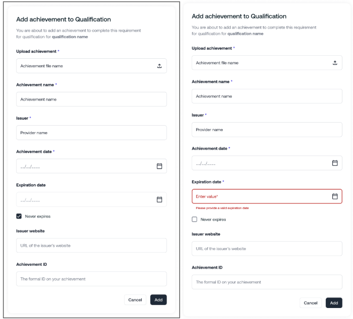 Für Zertifikate, die von Managern oder Benutzern selbst hochgeladen werden, wird es demnächst Pflicht sein, zusätzlich zum Erwerbsdatum auch ein Ablaufdatum anzugeben. Dies hilft Organisationen, Zertifikate effektiver zu verwalten, und stellt sicher, dass diese korrekt in den Benutzerportfolios und innerhalb der Qualifikationen angezeigt werden.