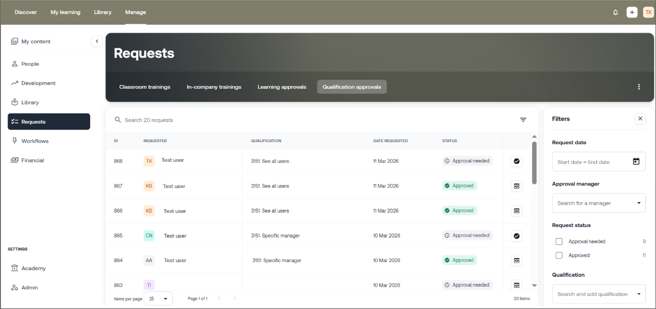Um die Verwaltung von Qualifikationen zu vereinfachen, führen wir eine zentrale Übersicht aller ausstehenden Genehmigungsanfragen ein. LMS Manager und Team Manager können nun einfach einsehen, welche Qualifikationen noch auf eine Genehmigung warten, und diese schneller bearbeiten.