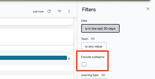 Reporting-Dashboards sind nun einfacher zu bedienen für Organisationen mit einer Team-Hierarchie. Mit einem einzigen Klick können Sie Unterteams ausschließen, indem Sie den Filter „Unterteams ausschließen" aktivieren. Dies erleichtert die Analyse von Lernaktivitäten und -leistungen innerhalb bestimmter Ebenen der Organisation.