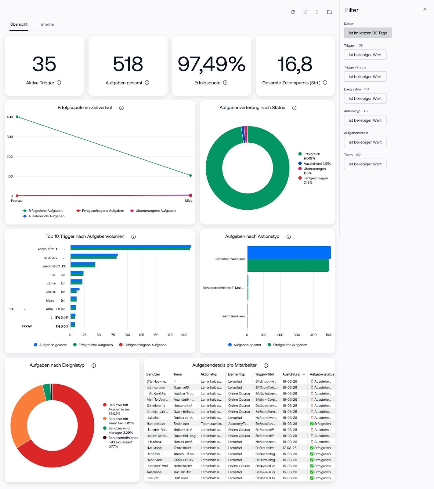 Darüber hinaus zeigt das Dashboard, was jeder Trigger zugewiesen hat, an wen und auf Basis welcher Aktion. Dies ermöglicht es Managern, schnell nachzuvollziehen, wie oft ein Trigger für eine bestimmte Person oder ein bestimmtes Team aktiviert wird, und zu überprüfen, ob alles wie erwartet funktioniert. Dies hilft Organisationen, ihre Automatisierungen besser zu überwachen und bei Bedarf zu optimieren.
