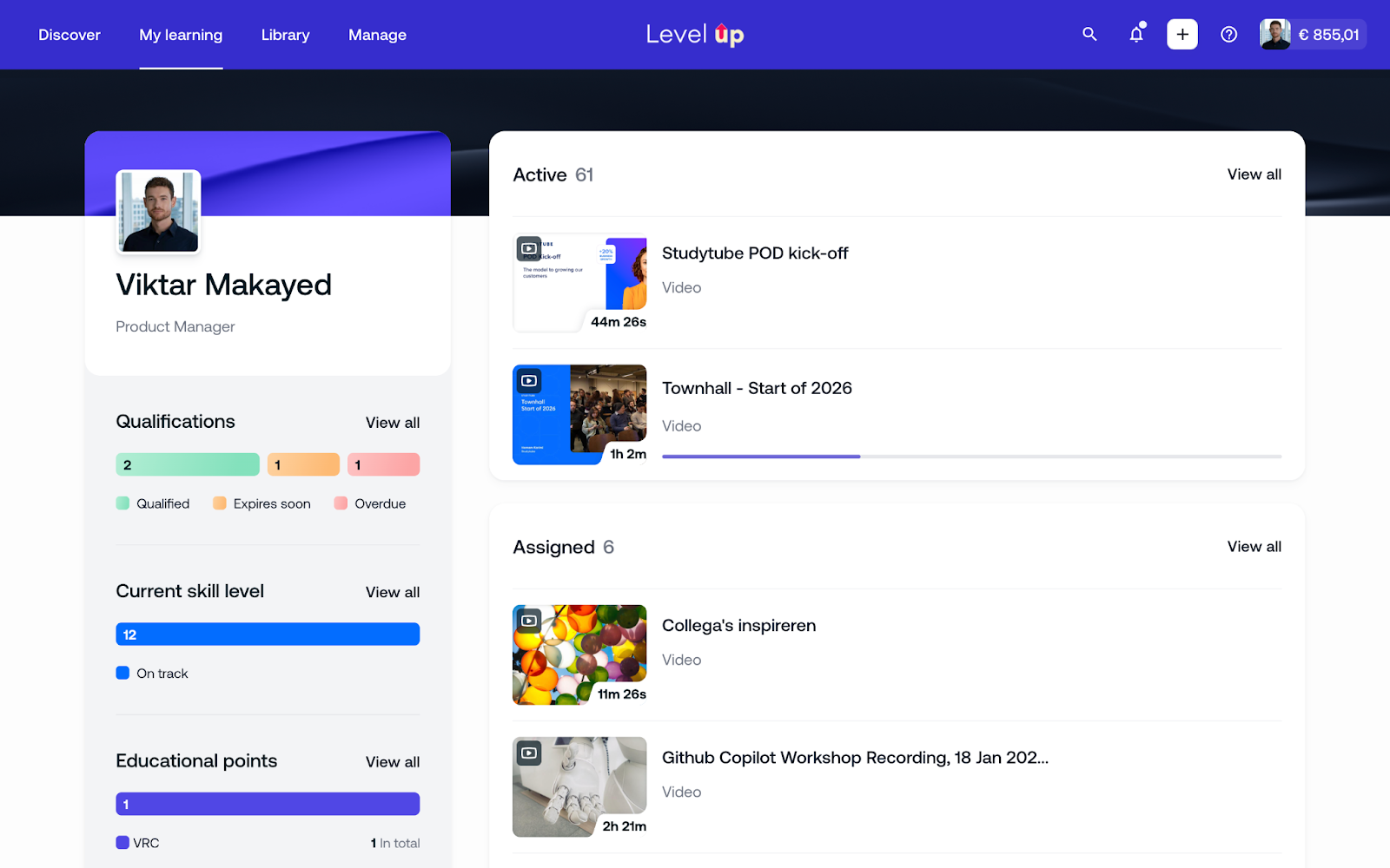Zugewiesene Lerneinheiten werden nun weiter oben auf der Seite „Meine Entwicklung" angezeigt, sodass Benutzer sie leichter finden können.