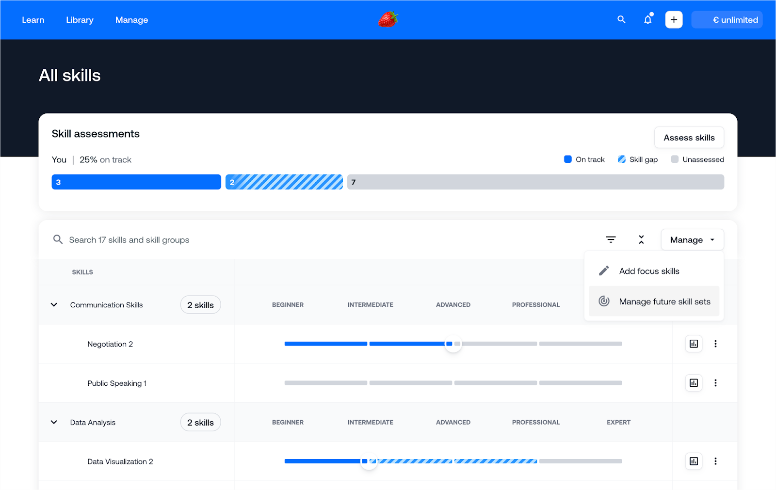 Über Meine Lerneinheiten > Skills können Benutzer ihre zukünftigen Skill Sets auswählen und verwalten.