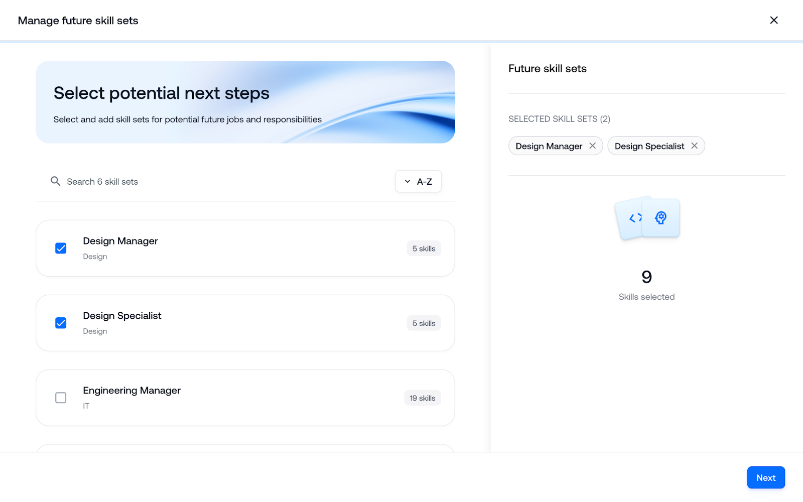 Benutzer können ein oder mehrere Skill Sets auswählen, die sie entwickeln möchten.