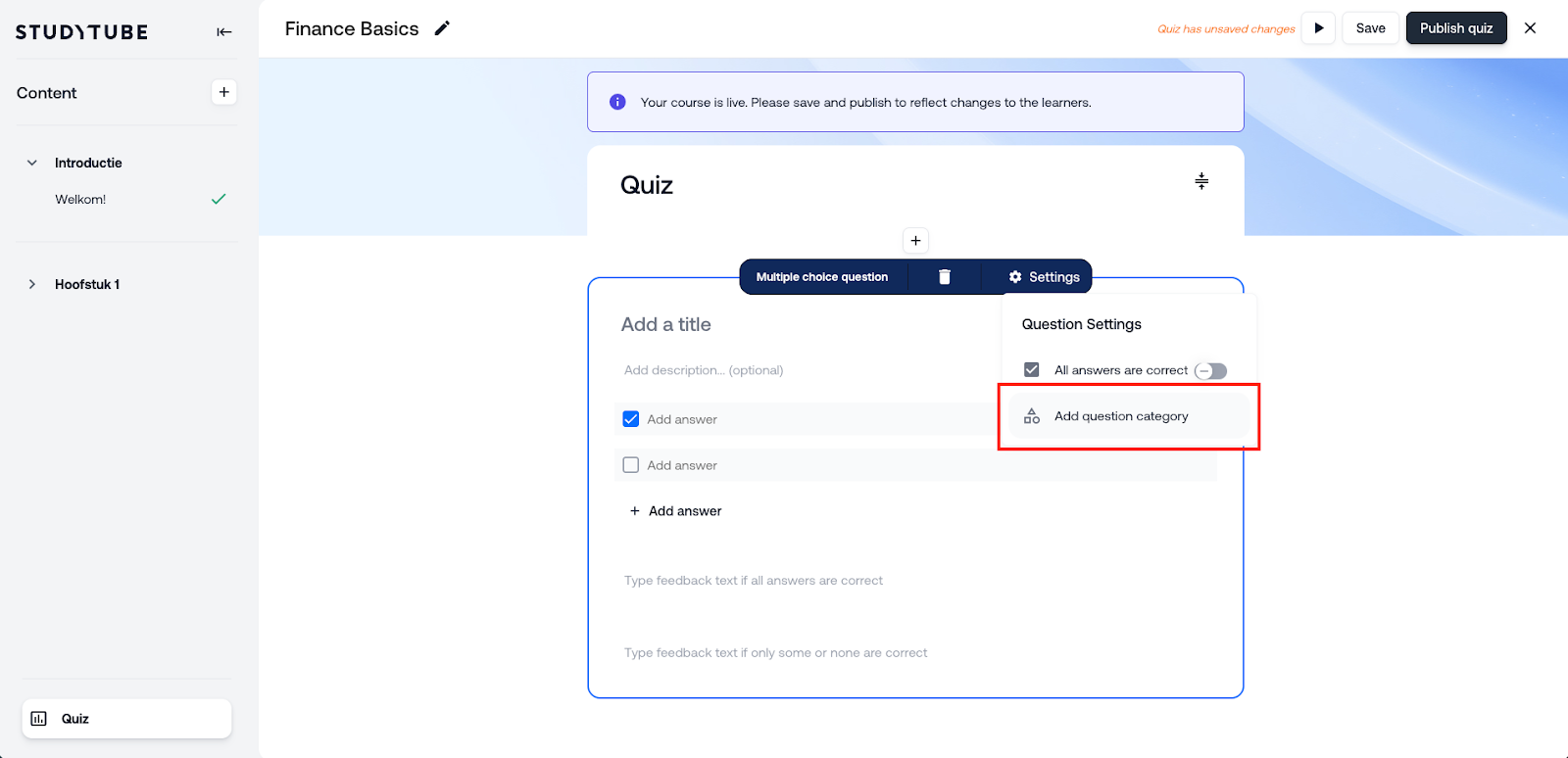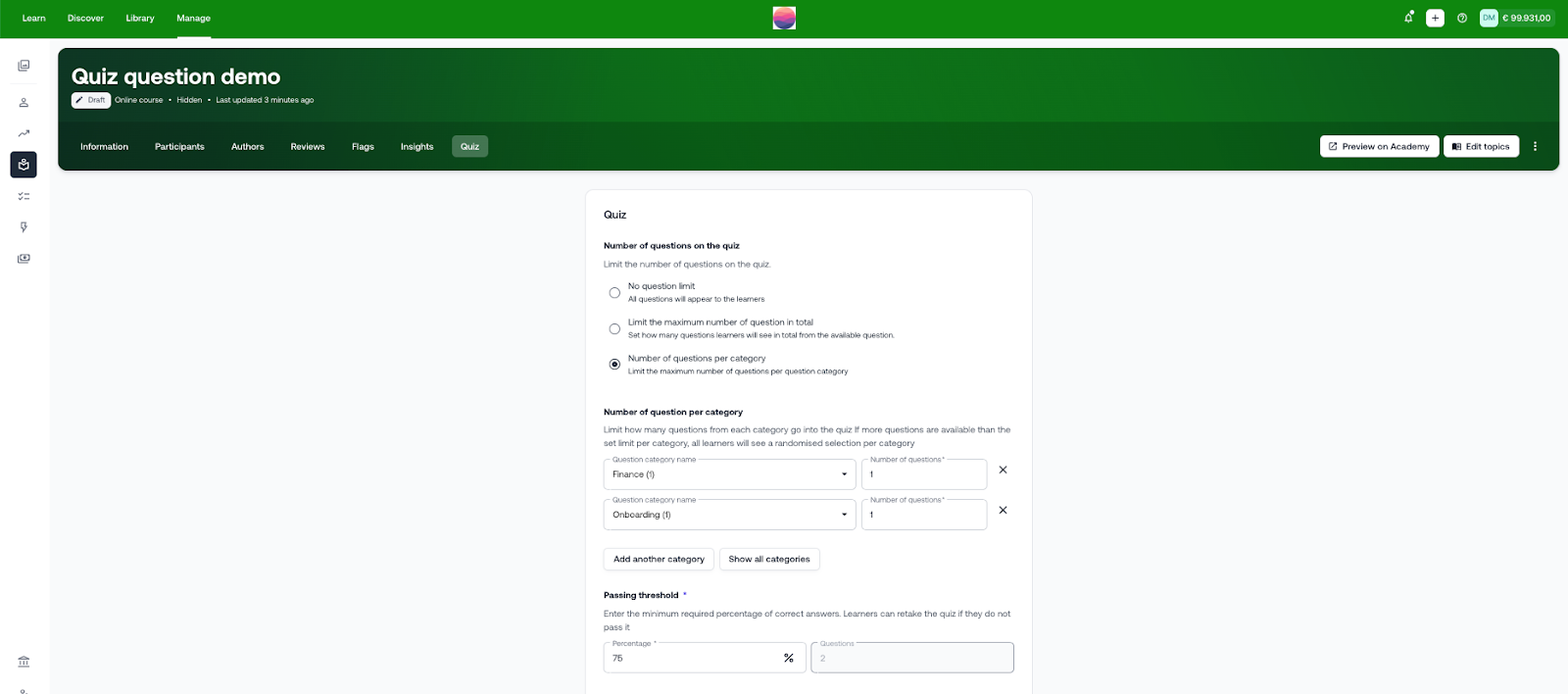 Fragekategorien können direkt im Autorentool beim Erstellen eines Quiz angelegt werden, indem man oben bei der Frage „Einstellungen" und anschließend „Fragekategorie hinzufügen" auswählt. Darüber hinaus wird in den Online-Kurs-Einstellungen ein neuer Tab „Quiz" verfügbar sein, in dem Sie folgendes können:
