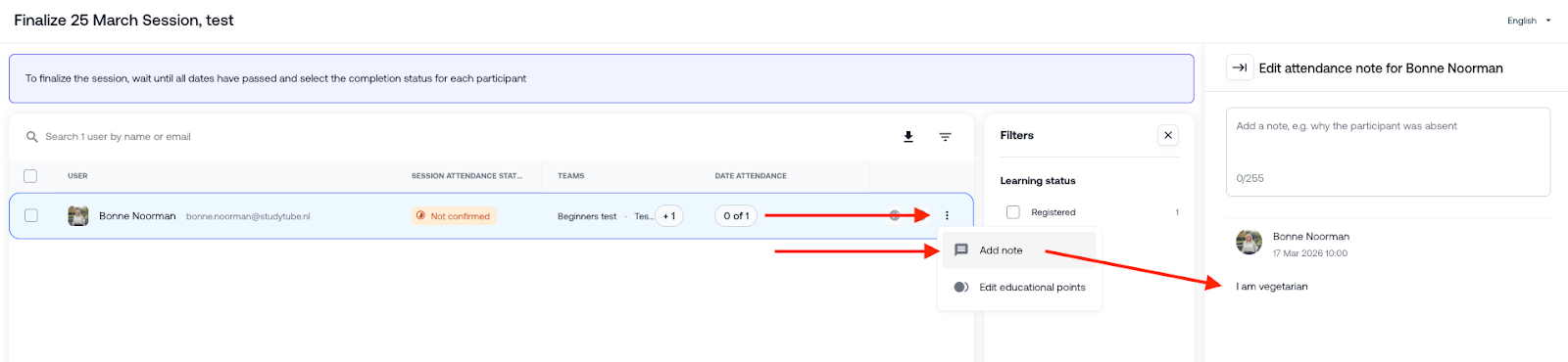 - Klicken Sie auf die drei Punkte neben einem Teilnehmenden und wählen Sie „Notiz hinzufügen".