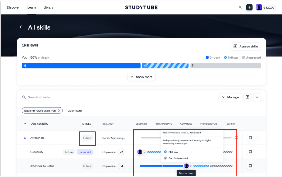 Basierend auf dem aktuellen Skill-Level eines Benutzers stellt die Plattform anschließend gezielte Lernempfehlungen mithilfe von Lerneinheiten aus der Akademie bereit. Dies hilft Benutzern, ihre Entwicklung zu planen und auf ihre nächsten Karriereschritte hinzuarbeiten.