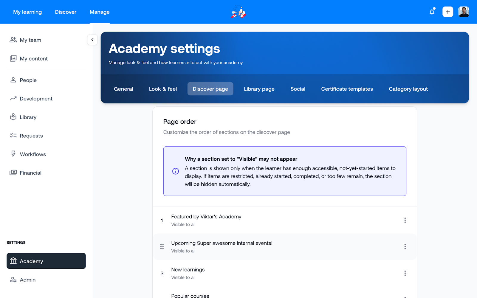 Im vorherigen Release erhielten LMS Manager mehr Kontrolle über die Entdecken Seite, mit der Möglichkeit, die Reihenfolge festzulegen, in der verschiedene Lernformate angezeigt werden.