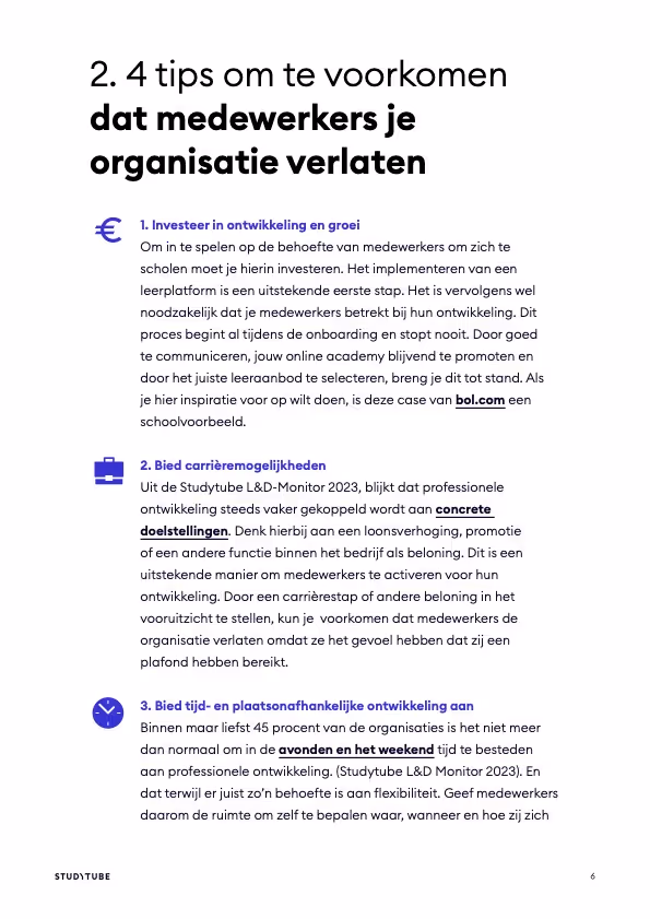 Je krijgt bovendien praktische strategieën: van interne communicatie en digitale onboarding tot leiderschapsbetrokkenheid, carrièrekansen en relevante leercontent. Zo bouw je stap voor stap aan een cultuur waarin medewerkers gemotiveerd leren en groeien.