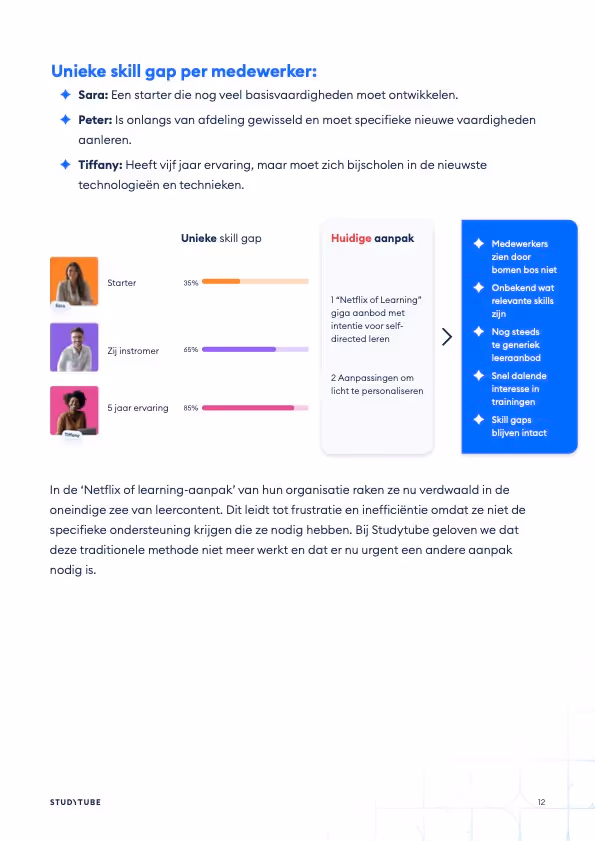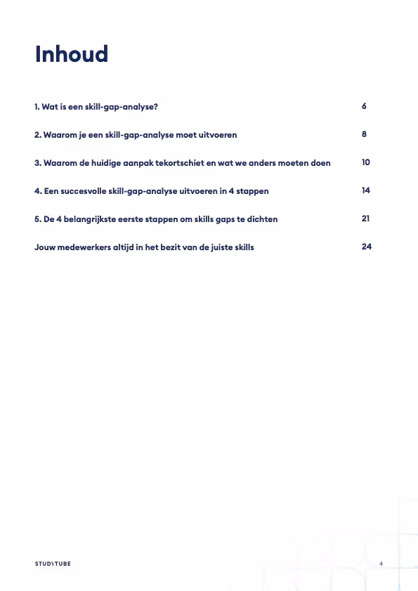 Skill gaps vormen een grote bedreiging voor productiviteit, innovatie en wendbaarheid. Dit e-book laat zien waarom organisaties vandaag midden in een skill-gap-crisis zitten en waarom de traditionele ‘Netflix-of-learning’ aanpak medewerkers juist overweldigt en skill gaps in stand houdt. Je ontdekt hoe je met een skill-gap analyse exact ziet welke skills ontbreken op organisatieniveau, teamniveau én individueel niveau en hoe je daarop gericht kunt ontwikkelen.