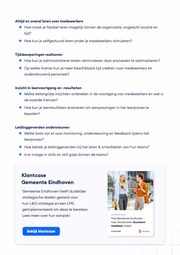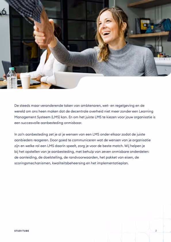 Een LMS kiezen binnen de decentrale overheid vraagt om een goed doordachte aanpak. Dit e-book helpt je stap voor stap bij het creëren van een sterke aanbesteding die volledig aansluit op de strategische en operationele doelen van jouw organisatie. Je leert hoe je een duidelijke aanleiding formuleert, concrete doelstellingen bepaalt en de dagelijkse uitdagingen in kaart brengt die een LMS kan oplossen.