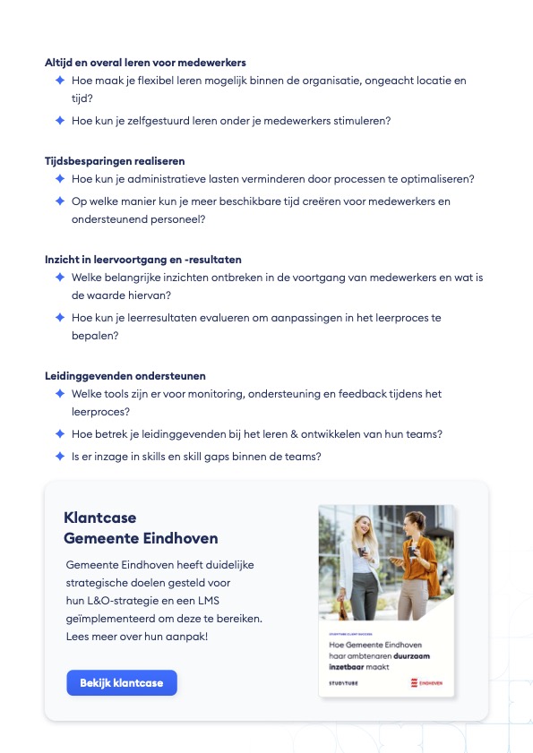 Daarnaast krijg je praktische richtlijnen voor het opstellen van randvoorwaarden, het bepalen van noodzakelijke koppelingen, het beoordelen van leveranciers en het slim toepassen van prijs/kwaliteit-scoringsmodellen. Het e-book biedt bovendien handvatten voor kwaliteitsbeheersing, gebruikerstesten, juridische flexibiliteit en het plannen van een effectieve implementatie. Zo ben je optimaal voorbereid om een toekomstbestendig leerplatform te selecteren dat écht aansluit op de behoeften van jouw organisatie.