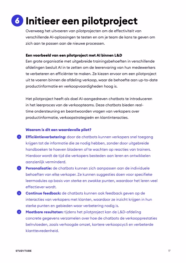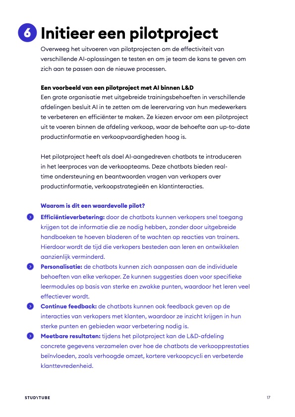 Deze gids helpt je stap voor stap om deze obstakels te overwinnen en AI effectief te integreren in je organisatie. Ontdek hoe je interne afstemming bereikt, een succesvol implementatieplan maakt, een pilotproject opzet, en de effectiviteit van AI meet. Zo kun je optimaal profiteren van AI en je medewerkers beter ondersteunen in hun groei.