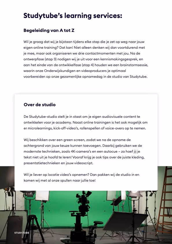 Je krijgt een helder stappenplan voor schrijven, vormgeven, filmen en testen, inclusief ondersteuning van onderwijskundigen en videoproducers. Ook ontdek je hoe een opnamestudio, green screen en professionele tools je content naar een hoger niveau tillen en hoe je trainingen eenvoudig actueel houdt met reviews en snelle updates.